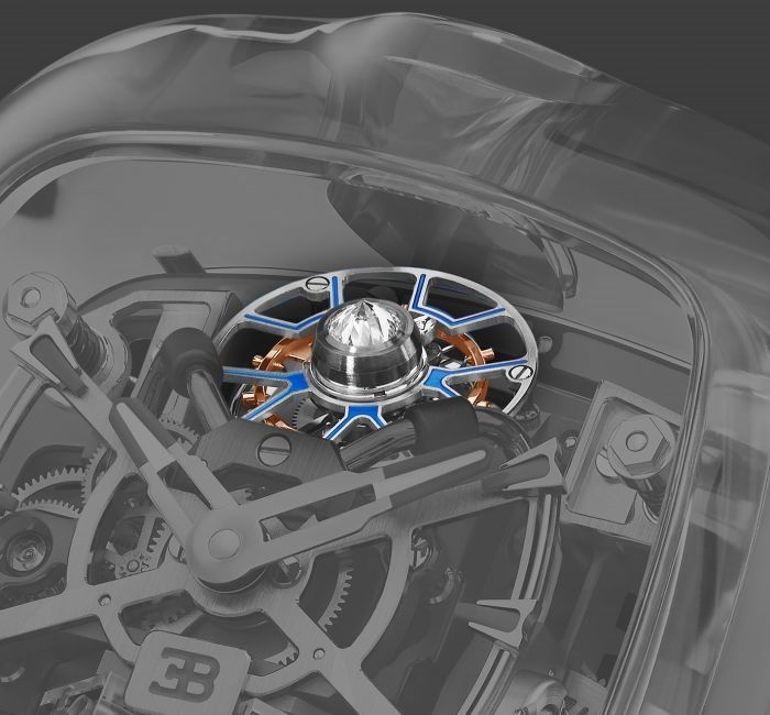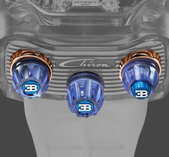 تتميز الساعة، التي يطلق عليها اسم Bugatti Chiron Blue Sapphire Crystal ، بالعديد من الميزات، منها أنها تتمتع بنسخة طبق الأصل كاملة الوظائف لمحرك شيرون W16 رباعي الشاحن رباعي الأسطوانات سعة 8 لترات.