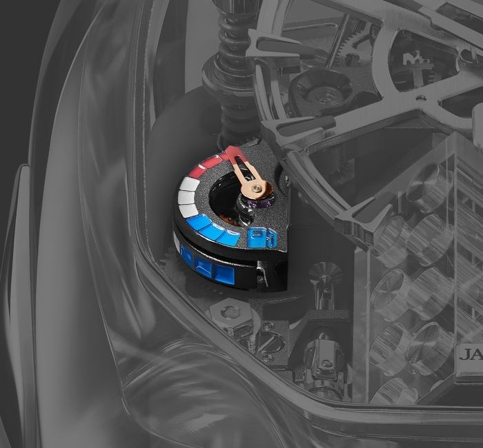 من الخلف ، تُظهر Bugatti Chiron Blue Sapphire Crystal بعضًا من 578 مكونًا مزينًا يدويًا ومجمع يدويًا تشكل الآلية. يمكن رؤية العديد من الجواهر الـ 51 المستخدمة في الساعة من الخلف. تشمل التفاصيل الأخرى المدهشة للساعة احتياطي طاقة مستوحى من مقياس وقود شيرون وثلاثة تيجان من الياقوت.