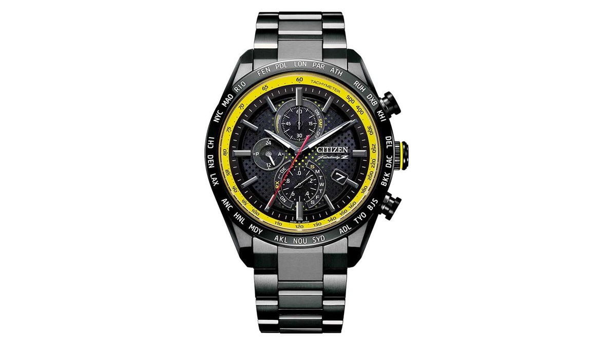 من ناحية أخرى، يتميز موديل AT8185-97E بلمسات باللون الأزرق السيران. يصنع هذا تباينًا مع الأسود غير اللامع في وسط الميناء الذي يشبه الأسفلت الناعم. العقارب مطلية باللون الفضي.