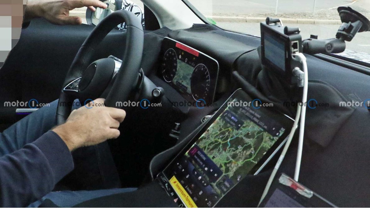 تبدو المقصورة مشابهة تمامًا للمقصورة الداخلية الموجودة في الفئة C الجديدة، والتي استوحت الإلهام من الفئة S الأكبر والأكثر فخامة. وتكشف اللقطات رؤية أوسع للمقصورة الداخلية التي تكشف عن شاشة مجموعة العدادات الجديدة وشاشة المعلومات والترفيه المائلة في لوحة العدادات. تغطي مرسيدس باقي الأجزاء الداخلية – لوحة القيادة والأبواب - بقطعة قماش سوداء.