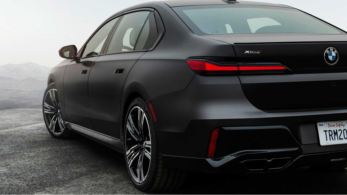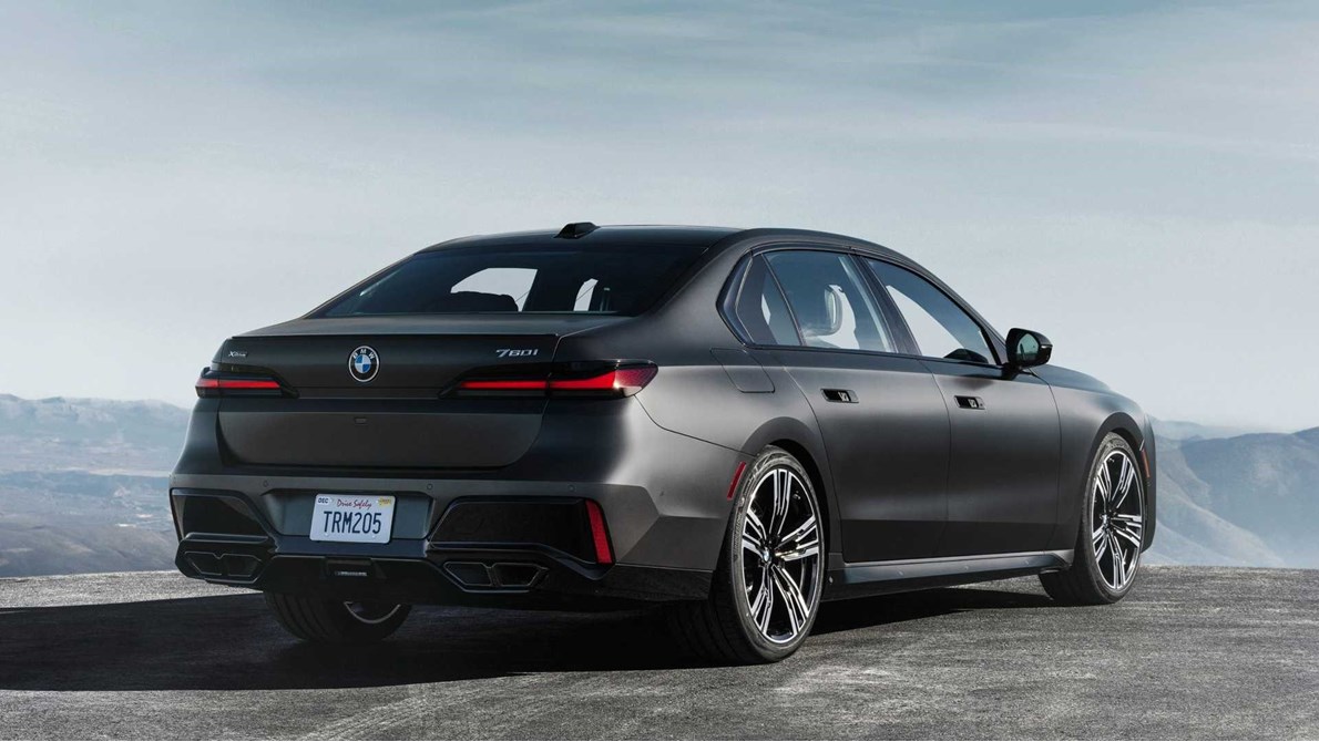 ويتميز الجزء الخلفي بمصابيح خلفية أنيقة، ومتوفرة بلمسات سوداء أو كروم، على الرغم من غياب الطراز الرياضي M7، وستحصل كافة طراز الفئة السابعة على فتحات عادم رباعية، حتى أن النسخة الكهربائية i7 ستحصل على تصميم خلفية مماثل، بينما تختفي فتحات العادم كفارق وحيد في التصميم.