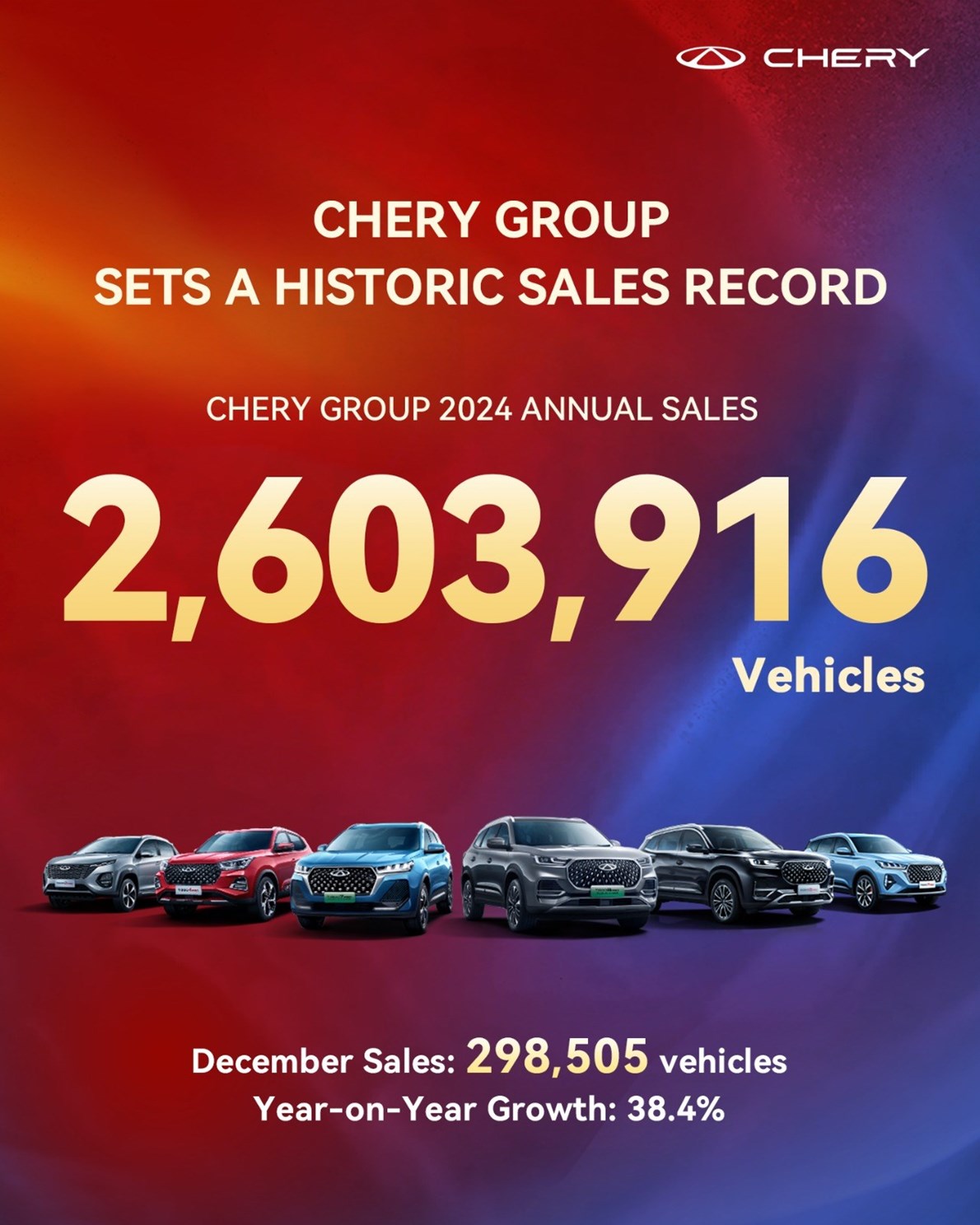سجلت شركة شيري رقماً قياسياً عالمياً جديداً في عام 2024، حيث بلغت مبيعاتها الشهرية في ديسمبر 298,505 سيارة، بزيادة ملحوظة قدرها 38.4% مقارنة بالشهر نفسه من 2023. وارتفع إجمالي مبيعاتها السنوية إلى 2,603,916 سيارة، محققةً نمواً بنسبة 38.4% عن عام 2023، متفوقةً بذلك على متوسط معدلات نمو قطاع السيارات بفارق كبير.