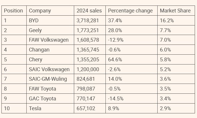وتصدرت العلامة "بي واي دي BYD" القائمة، كأكثر الشركات مبيعًا للسيارات خلال العام، حيث بلغت مبيعات سياراتها 3,718,281 وحدة بارتفاع نسبته 37.4% مثارنة بعام 2023، مستحوذة بذلك على 16.2% من المبيعات الإجمالية بالسوق الصينية، مما يعني أن واحدة من كل 6 سيارات تباع في الصين هي من إنتاج "بي واي دي".