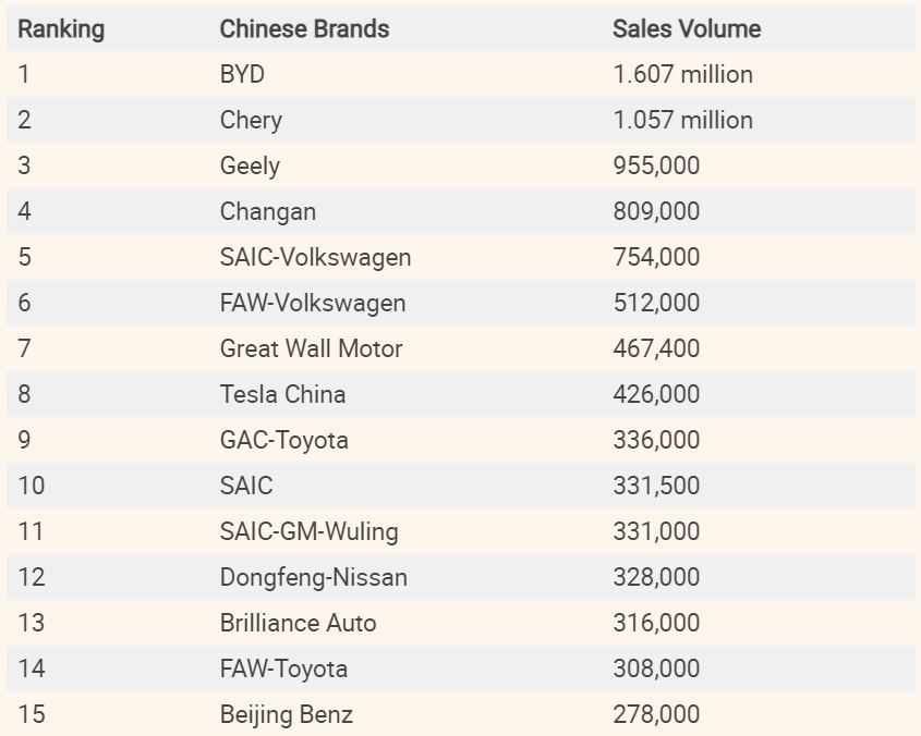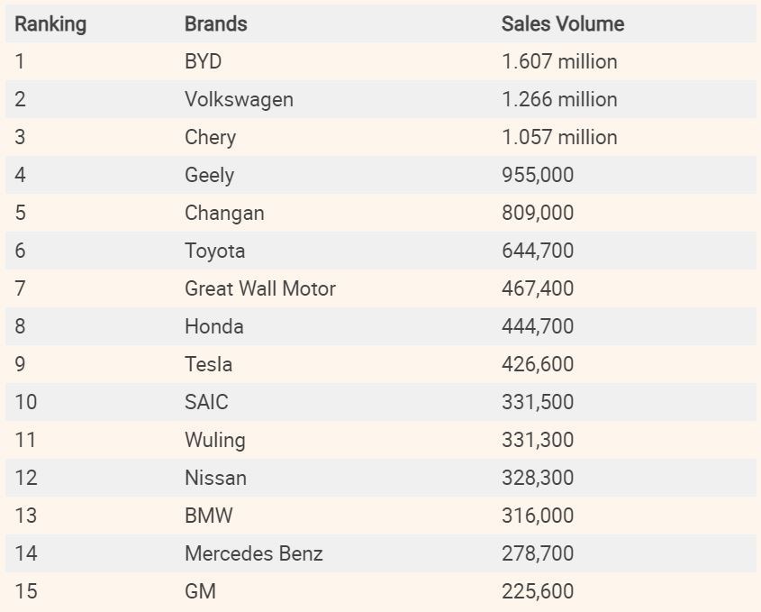 أما على صعيد العلامات التجارية، فقد بلغت مبيعات الشركات الصينية وحدها 11.917 مليون مركبة، بزيادة 6.3% عن العام الماضي، لتستحوذ بذلك على 84.8% من إجمالي المبيعات المحققة في السوق الصيني. وتتربع "بي واي دي" على عرش المبيعات بحوالي 1,607 مليون مركبة تم بيعها خلال الفترة من يناير إلى يونيو.