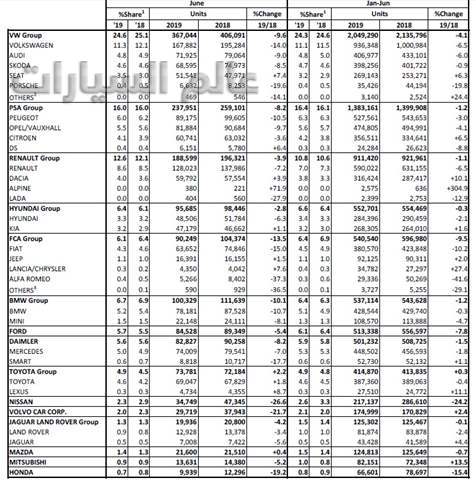 سجلت مبيعات السيارات الجديدة في الدول الأوروبية لشهر يونيو الماضي انخفاضاً بنسبة 7.8% مقارنة بيونيو 2018، وكانت الانخفاضات الأكبر من نصيب نيسان، فولفو، هوندا وطرازات فيات كرايسلر.