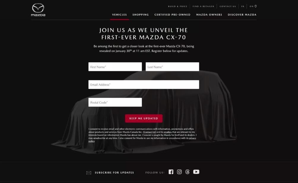 تستعد الصانعة اليابانية "مازدا Mazda" لإزاحة الستار عن الكروس أوفر SUV متوسطة الحجم CX-70، في اليوم الثلاثين من شهر يناير الجاري، بعد تأكيد الموعد على موقعها الإلكتروني الكندي، والتي كان من المفترض تدشينها العام الماضي ولكن تم ترحيل الموعد لبداية 2024.