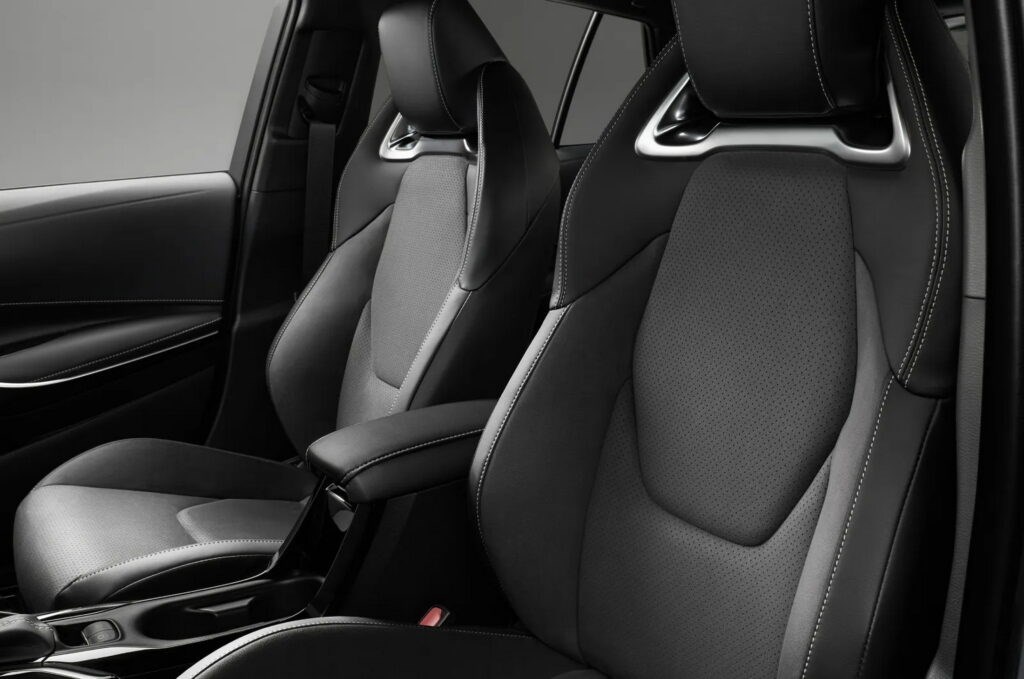 داخل المقصورة أضافت "تويوتا" مقاعد أمامية رياضية بمساند رأس مدمجة ووسائد ظهر بارزة، مع لمسات من الألومنيوم وفرش من الجلد الصناعي بخياطة لون رمادي، لتتناقض مع لون المقصورة الأسود بالكامل، وفي الأسفل تأتي دواسات القدم من الألومنيوم، فيما يمكن الحصول على فرش الأرضية بالشعار بشكل اختياري.