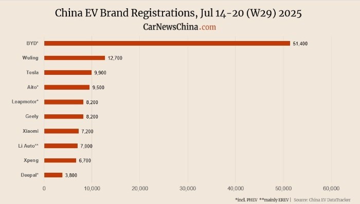 سجلت علامة BYD الرئيسية 58,810 مركبة خلال الأسبوع الثلاثين (21 – 27 يوليو)، بزيادة أسبوعية قدرها 14.4%، لكنها انخفضت بنسبة 16.7% مقارنة بالفترة نفسها من العام الماضي. وبلغ إجمالي تسجيلاتها في الأسابيع الأربعة الأولى من يوليو 214,560 مركبة.كما سجلت باقي علامات مجموعة BYD أداءً متوازنًا: