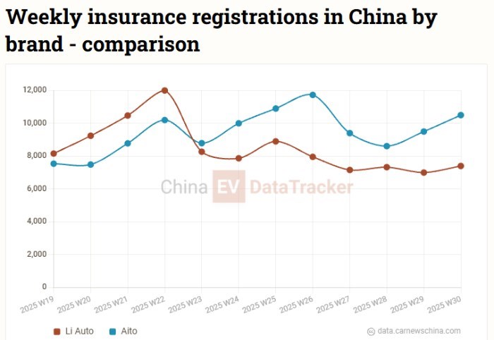 حققت AITO، المدعومة من هواوي، مبيعات بلغت 10,500 سيارة (+10.5%)، بإجمالي 38,010 مركبة خلال يوليو، ما جعلها تتفوق على لي أوتو التي سجلت 7,400 مركبة فقط هذا الأسبوع، بانخفاض سنوي حاد بلغ 42.2%.