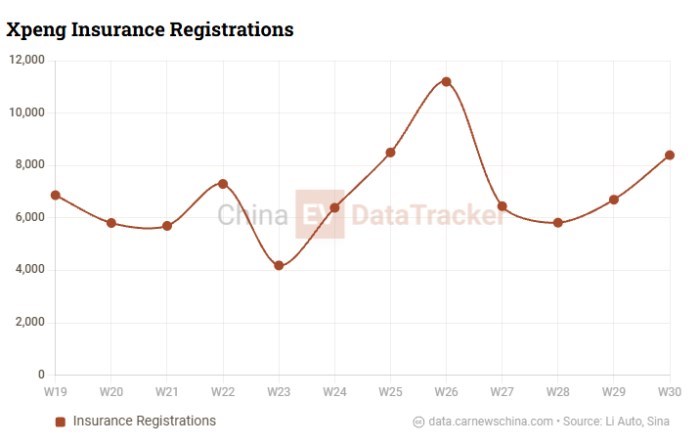 شهدت Xpeng، المدعومة من فولكس فاجن، ارتفاعًا أسبوعيًا بنسبة 25.4% لتسجل 8,400 وحدة، وقفزة سنوية ضخمة بنسبة 250%. بلغت مبيعاتها خلال يوليو 27,370 مركبة.