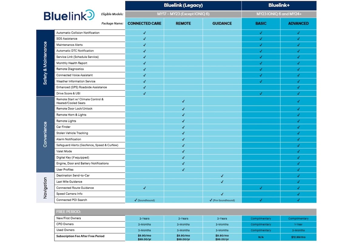 الجدير بالذكر أن هيونداي عندما أعلنت عن وظائف Bluelink+ الجديدة أوضحت أن التطبيق سيتم تقسيمه إلى جزأين؛ الأول للموديلات من 2017 إلى 2023 يستخدم فيها الملاك تطبيق Bluelink Legacy، بينما الثاني بدءًا من السيارة "أيونيك 6" الجديدة وموديلات 2024 و سيتم فيهم استخدام تطبيق Bluelink+ الجديد.