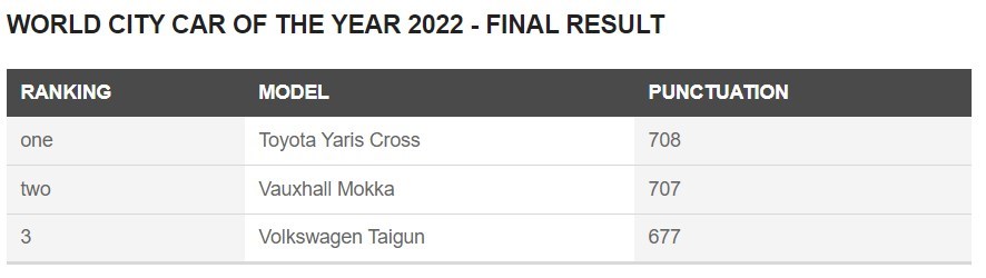 وفي جائزة السيارة الأفضل للاستخدام في المدينة على مستوى العالم لعام 2022 جاءت تويوتا ياريس كروس (النسخة الكروس أوفر من ياريس) في المرتبة الأولى، لتتبعها أوبل موكا ثم فلوكس فاجن تيجوان.