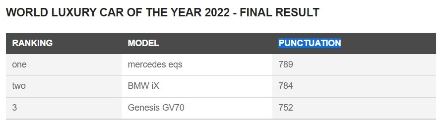 حيث حازت مرسيدس EQS على جائزة السيارة الأكثر فخامة في العالم لعام 2022 متفوقةً على غريمتها الألمانية BMW iX والكورية جينيسيس GV70 والتي جاءت في المرتبة الثالثة ضمن هذا التصنيف.