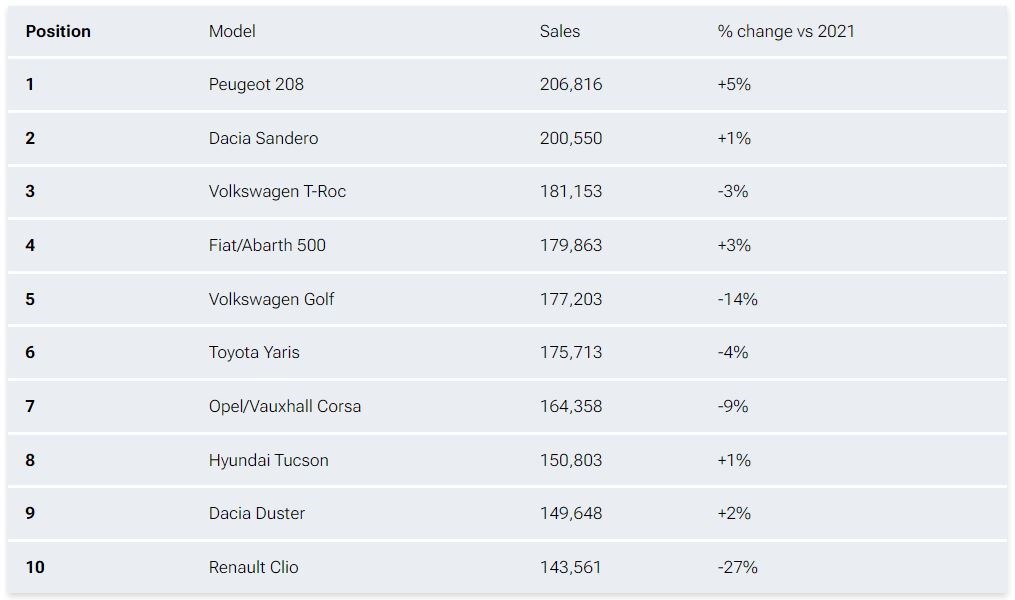 ورغم الإطاحة بالسيارة "جولف" من المركز الأول إلا أنها لم تتمكن حتى من البقاء في المركز الثاني، ولكن أرقام مبيعاتها خلال العام الماضي نزلت بها إلى المركز الخامس، وذلك وفقًا لتقارير JATO، بينما جاءت في المركز الثاني السيارة "داتشيا سانديرو" التي بلغت مبيعاتها 200,550 سيارة بزيادة نسبتها 1% عن عام 2021، وتليها في المركز الثالث "فولكس فاجن تي-روك" التي تعتبر الأعلى مبيعًا في فئة الـ SUV رغم انخفاض مبيعاتها بنسبة 3%.