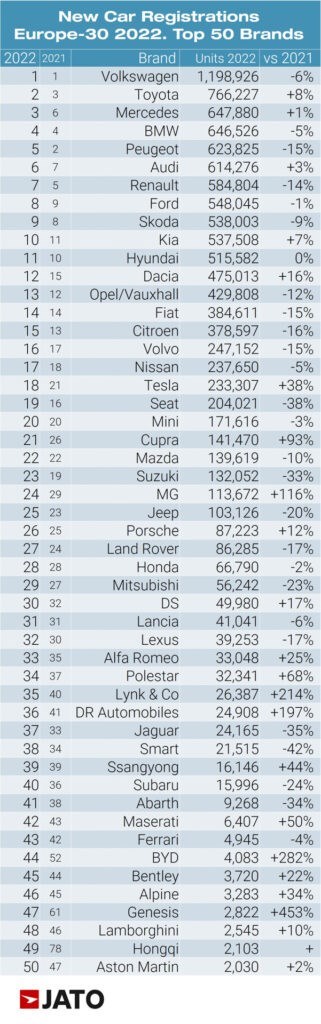 وقد كانت السيارة "تسلا موديل Y" في وقت ما خلال العام 2022 هي السيارة الأعلى مبيعًا في أوروبا، إلا أن محصلة العام الإجمالية أودت بها إلى المركز الثالث عشر بعدد 138,128 تسجيلاً.
