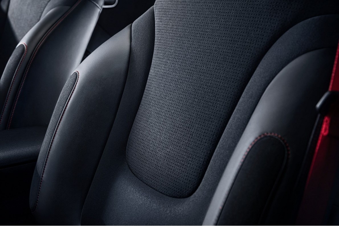 المقاعد منجدة بالجلد الصناعي والجلد الطبيعي المدبوغ والمصنوع من الألياف الدقيقة مع خياطة حمراء وأحزمة أمان حمراء، وعجلة القيادة مكسوة بقماش الكانتارا، والدواسات مصنوعة من الألمنيوم.