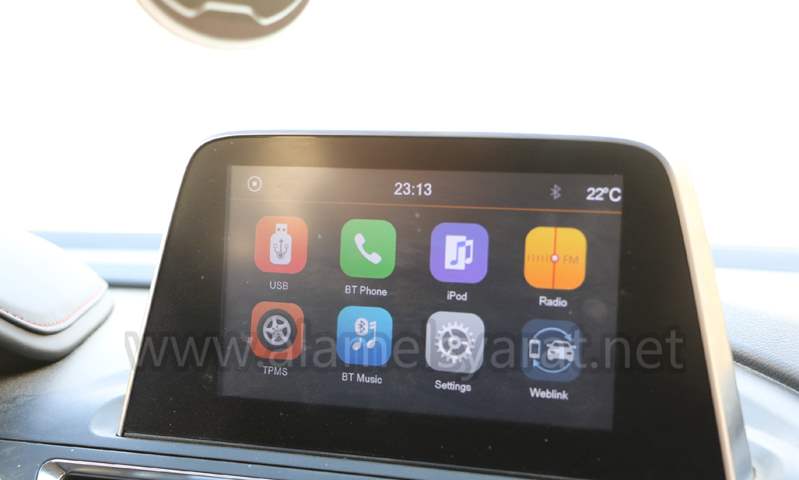 وتبرز الشاشة الوسطية أعلى التابلوه وهي مقاس 8 بوصات يتم من خلالها عرض معلومات عن السيارة وعن الوسائط المتعددة. وتبرز أسفل الشاشة فتحات التكييف وبعدها وحدة أزرار للتحكم فى مشغل الموسيقى. وفى النهاية من الاسفل تبرز وحدة التحكم فى تكييف السيارة.
