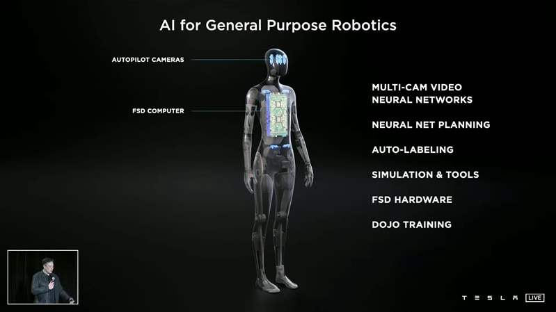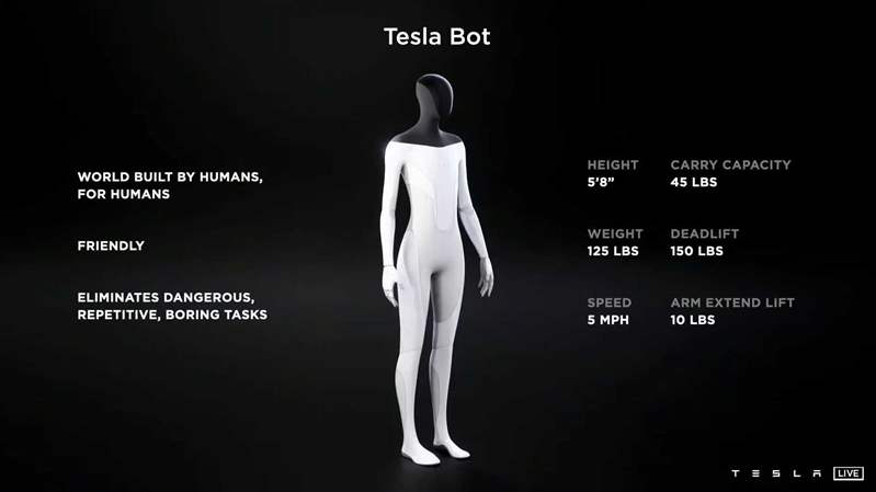 كشفت الشركة الأمريكية "تسلا Tesla" المتخصصة في تصنيع السيارات الكهربائية عن قيامها بتطوير أول روبوت آلي ذي هيئة بشرية "تسلا بوت Tesla Bot"، وذلك خلال عرض تقديمي لها على الانترنت ضمن حدث Autonomy Day أو اختصارًا AI Day، والذي تضمن أيضًا الكشف عن شريحة جديدة من أجل الحاسوب الفائق Dojo.