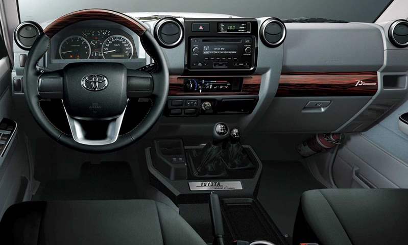 في الداخل، تحتوي نسخة الذكرى السبعين على تنجيد أسود على المقاعد. يلتف الجلد المتناسق حول عجلة القيادة وذراع التروس. لوحة خشبية تزين لوحة القيادة وأعلى عجلة القيادة. لمسات فضية حول فتحات التهوية، ويحتوي الكونسول الوسطي على لوحة تحمل شعار Land Cruiser القديم. يوجد أيضًا زوج من منافذ USB وحاملي أكواب.