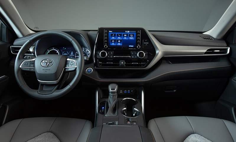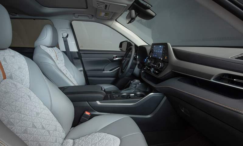 وتستمر اللمسات البرونزية داخل المقصورة بدءًا من عتبات الأبواب المضيئة التي تبدو وكأنها سبيكة برونزية تحمل ختم "HIGHLANDER"، إلى جانب الخياطة باللون البرونزي في أنحاء المقصورة مثل لوحة القيادة والألواح الداخلية للأبواب، وشعار السيارة المطرز بالبرونزي أيضًا على أرضية الصندوق الخلفي والدواسات الأرضية. ويأتي فرش السيارة من الجلد الذي تتخلله إضافات من القماش، يحمل أشكال هندسية توحي بالفخامة بطابع مستوحى من منتصف القرن الحديث، وفقًا لتويوتا.