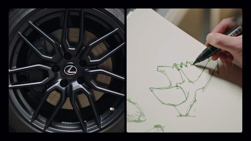 بدءًا من الأسفل إلى الأعلى، يتميز الحذاء بنعل مستوحى من الإطارات يلتف حول الجوانب، إلى جانب طرف أسود مصمم لاستدعاء شبكة عمود الدوران الخاصة بعلامة لكزس التجارية.