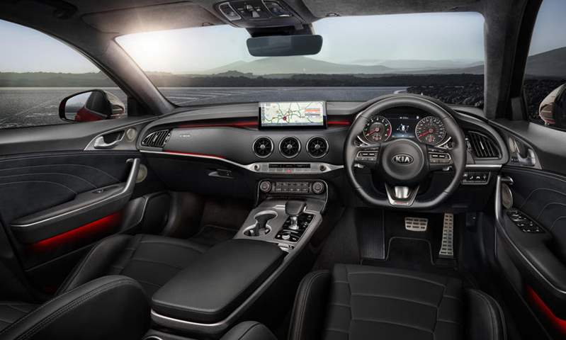 تنطلق ستينجر كما هي بالدفع الخلفي كنظام قياسي في المملكة المتحدة، بينما يستمر طرحها بنظام الدفع الرباعي في الأسواق ذات نظام قيادة (اليد اليسرى).. وبعد استبعاد محرك البنزين التربو وكذلك المحرك الديزل، أصبحت السيارة متاحة في السوق الإنجليزي فقط بالمحرك الأقوى V6 سعته 3.3 لترًا ومتصل بشاحن تيربو مزدوج لتنطلق منه قوة 366 حصانًا، ويتصل بناقل حركة أوتوماتيك ذي 8 سرعات، بحيث تنطلق السيارة من سكونها إلى سرعة 100 كم/س خلال 4.7 ثوان فيما تصل سرعتها القصوى إلى 269 كم/س.. ما يجعلها أسرع طرازات كيا المطروحة في أوروبا حتى الآن.