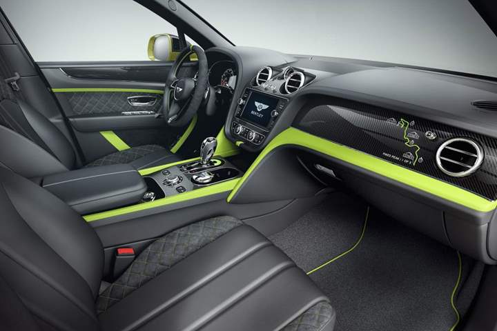 في الداخل تمتزج المقصورة السوداء بلمسات خضراء من نفس لون الجسم الخارجي، تراها على الأبواب وأسفل لوحة القيادة وعلى جانبي الكونسول الوسطي، بالإضافة إلى خيوط حياكة المقاعد وخطوط رفيعة في كسوة الأرضية، بينما تلتف عجلة القيادة بجلد ألكانتارا الفاخر.. وقد زودت بنتلي السيارة بنظام تثبيت السرعة التكيفي ومساعد البقاء في الحارة المرورية وكاميرا للرؤية الليلية وذلك كتجهيز قياسي..