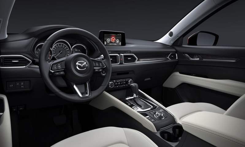 من ناحية الجماليات يحصل الإصدار الأعلى من CX-5 على مواد فاخرة تصنع ملامح المقصرة، فالمقاعد تكتسي بجلد نابا الفاخر ولوحة القيادة قد حصلت على تطعيمات من الخشب تمنحها لمسة أناقة واضحة، بينما تبدو الخطوط انسيابية ناعمة كموجات هادئة من المياه، وتستقر أعلى منتصف لوحة القيادة شاشة لمسية ملونة تتصل بنظام المعلومات والترفيه.