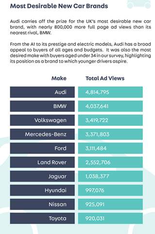 وجاءت فولكس واجن في المركز الأول فيما يتعلق بمشاهدات إعلانات السيارات الجديدة مع 1,307,303 مشاهدة، ثم فورد فوكاس مع 846,212 مشاهدة، فورد فييستا مع 721,306 مشاهدة، رينج روفر مع 617,085 مشاهدة، رينج روفر سبورت مع 591,323 مشاهدة، BMW الفئة الثالثة مع 562,523 مشاهدة، مرسيدس A-Class مع 541,700 مشاهدة، رينج روفر إيفوك مع 525,550 مشاهدة، فولكس واجن بولو مع 463,548 مشاهدة، مرسيدس C-Class مع 460,924 مشاهدة.