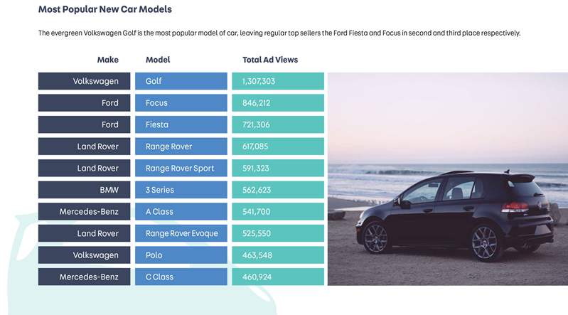 الدراسة تضمنت تحليل أكثر من 38 مليون مشاهد لإعلانات السيارات الجديدة على الإنترنت، ويعرض التقرير أيضاً علامات السيارات الأكثر رواجاً لـ 2019، إلى جانب العديد من التصنيفات الفرعية العديدة مثل أكثر السيارات الاقتصادية شعبية، تجهيزات أكثر سيارة شعبية أو أكثر ألوان السيارات الجديدة المرغوبة.