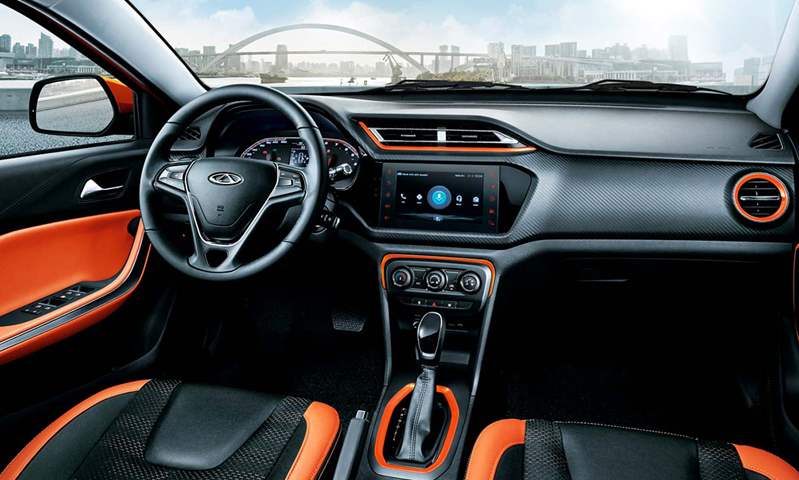 وبداخل "Tiggo 2" توجد تفاصيل شبابية واضحة حيث يتاح بنسق برتقالي اللون بأجزاء كثيرة من الكابينة. كما توجد تطعيمات بشكل ألياف الكربون بالتابلوه الذي يحوي شاشة تعمل باللمس قياس 8 بوصة يمكن ربطها بالهاتف الذكي. وتتوفر عدادات ذات شكل غير نمطي ذات لون أحمر بما يعطي طابعا رياضيا. ويستقبل "Tiggo 2" خمسة ركاب بالداخل و420 لترا من الأمتعة في الخلف بجانب توفير 21 نقطة للتخزين.