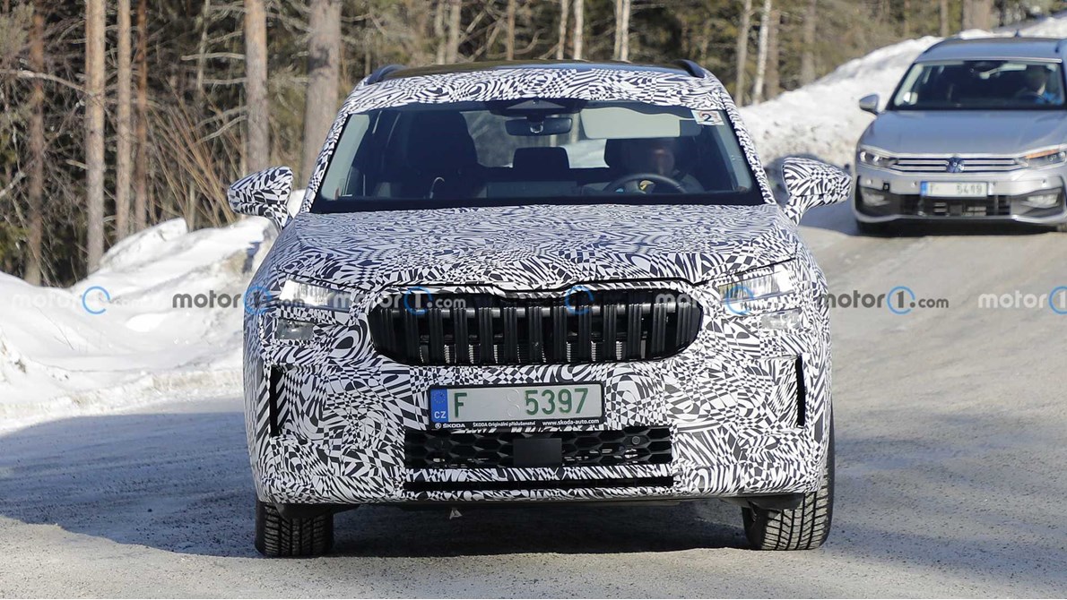 في المقدمة ، لن يختلف وجه Kodiaq الضخم كثيرًا عن الجيل الحالي.. تبدو الشبكة أكبر قليلاً مع وجود مصابيح أمامية أرق على الجانبين.. بالانتقال إلى لقطة قريبة للجزء السفلي، يبدو أن الشبكة السفلية تمتد على طول الإكصدام لتنتهي بفتحات رأسية في الزوايا.
