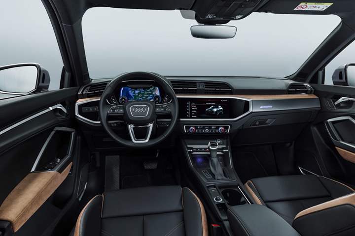 في الداخل لا تتنازل أودي عن الأناقة التي تبدو واضحة في لوحة القيادة ذات الخطوط الأفقية وإطار الكروم اللامع الذي يضم الشاشة اللمسية ولوحة العدادات، وعجلة القيادة ثلاثية الأذرع التي تحوي مجموعة من أزرار التحكم في وظائف الترفيه، وتفخر Q3 بنظام الأوامر الصوتية الذي يكفيه أن تنطق بجملة "أنا جائع" لتقترح لك الشاشة أماكن لتناول الطعام، أو جملة "نفد الوقود" لتستدعي أسعار الوقود وأماكن محطات التزود به..
