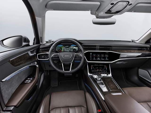 عند الدخول إلى مقصورة A6 ستبدو لك شديدة الاتساع؛ فبالإضافة إلى كونها أطول ببضعة ملليمترات من الطراز السابق هناك تلك الخطوط الأفقية المسيطرة على لوحة القيادة والتي تعزز الإيحاء باتساع المقصورة، وحتى فتحات المكيف تأتي بتصميم ممتد أفقيًا مع سيطرة للون الأسود، وتكتمل الأناقة بعجلة قيادة ثلاثية الأذرع ملفوفة بالجلد، وتطعيمات من الخشب تراها على لوحة القيادة وألواح الأبواب، ومقاعد مكسوة بالجلد الفاخر ومصممة لتمنح الدعم لأجساد الركاب، ويمكنك من موقعك على مقعد القيادة أن تلاحظ ميل الشاشة اللمسية والكونسول الوسطي قليلاً جهة السائق لتكون كافة التفاصيل في متناول أنامله..
