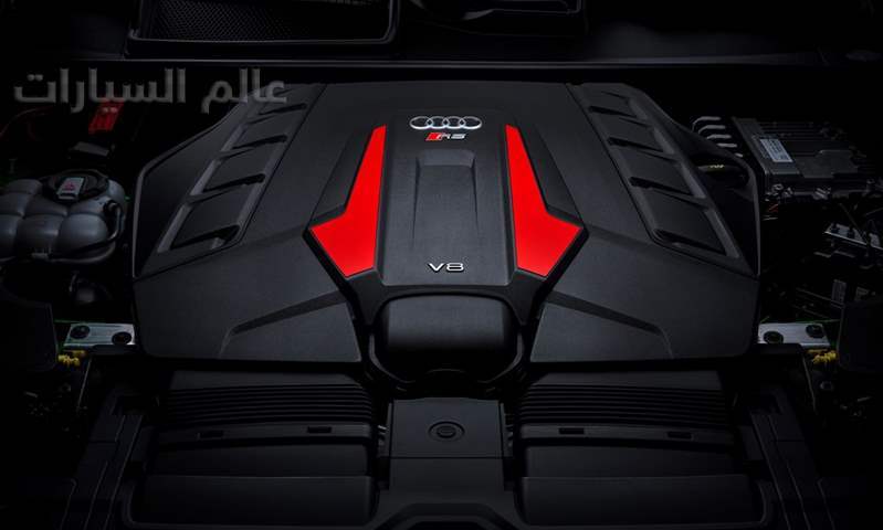 يأتي الطراز الرياضي RS Q8 مع محرك من نوع V8 مع شاحني تيربو بسعة 4 لتر، وهو بقوة 600 حصان مع 800 نيوتن. متر متاحة بين 2200 و4500 دورة/ دقيقة، أما زمن التسارع فيتم من صفر إلى 100 كم/ ساعة خلال 3.8 ثانية فقط، ومن صفر إلى 200 كم/ ساعة في 13.7 ثانية، مع سرعة قصوى محددة إلكترونياً عند 250 كم/ ساعة، ولمن يريد الوصول إلى سرعة قصوى قدرها 305 كم/ ساعة عليه الحصول على باقة ديناميك بلس الاختيارية، ويعمل هذا المحرك بتقنية الحقن المباشر للوقود، ويوفر صوتاً هادراً يمكن التحكم في شدته بواسطة نظام أودي درايف سليكت، المحرك ملحق به آخر كهربائي بقوة 48 فولت وهو ما يوفر كفاءة مرتفعة في استهلاك الوقود جنباً إلى جنب مع نظام الأسطوانة عند الطلب الذي يغلق نصف الأسطوانات عند عدم الحاجة إلى طاقة كبيرة، ويتصل المحرك بناقل أوتوماتيكي من 8 نسب يرسل الطاقة إلى العجلات الأربعة من خلال نظام كواترو.