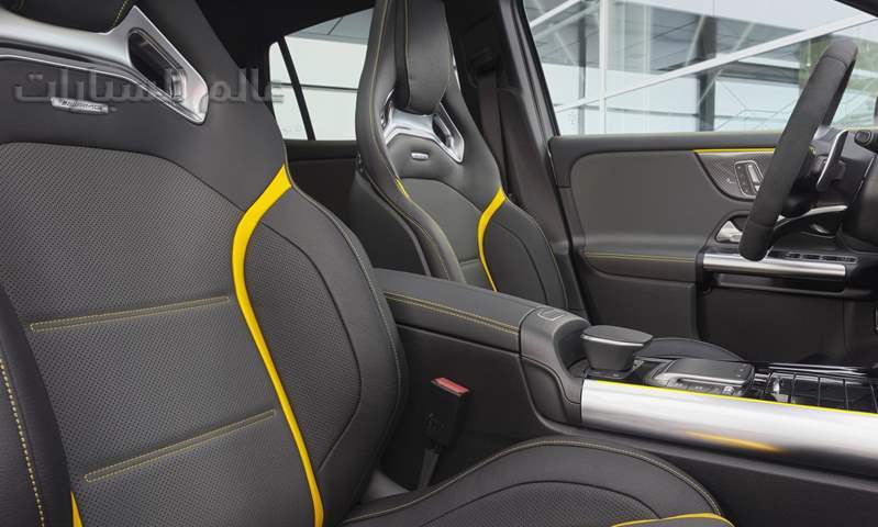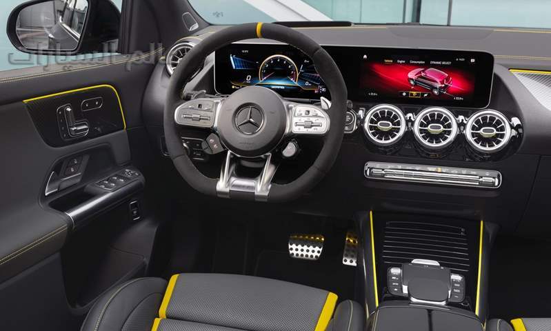 تأتي المقاعد في تنجيد رائع ممزوجًا ما بين الجلد الأسود والألياف الدقيقة مع تطعيمات وخياطة رائعة باللون الأصفر أو الأحمر، ولوحة قيادة من ألياف الكربون، يتوسطها نظام المعلومات والترفيه "MBUX".