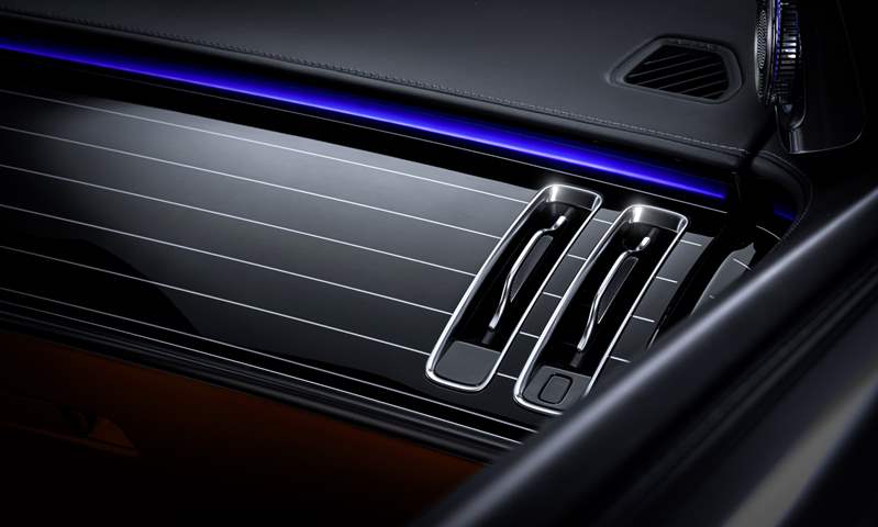 أحد الأشياء التي يجب أن نتطلع إليها عند الدخول إلى الفئة إس كلاس لعام 2021 هو الإضاءة الجديدة المحيطة بالمقصورة، حيث تصطف المئات من الألياف الضوئية المصنوعة من طلاء شفاف تمامًا على ألواح الأبواب وألواح الأرضية، في مصفوفة رومانسية ناعمة، وتتكون كل تركيبات الألياف الضوئية من حوالي 250 مصباح ليد، وعن هذه الإضاءة تقول مرسيدس إن الهدف هو أن تخلق تركيبات الإضاءة المحيطة الجديدة خطًا واحدًا مستمرًا من الضوء في جميع أنحاء السيارة.