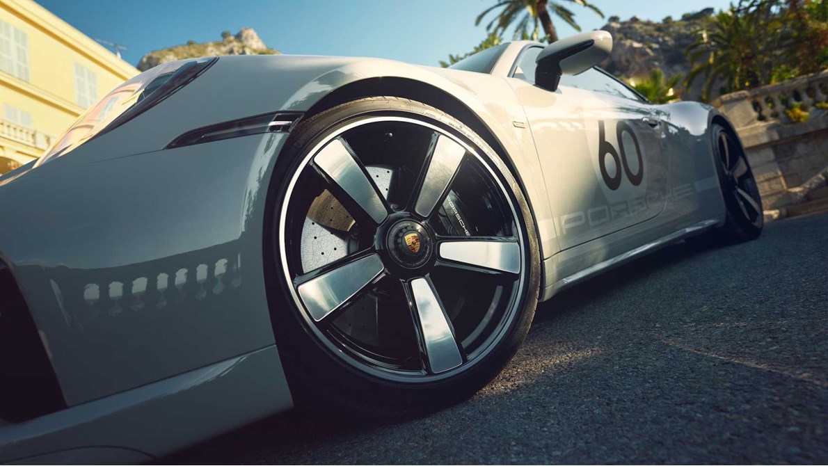 كان دمج الجزء الخلفي المتوهج من Turbo S في سبورت كلاسيك أمرًا مهمًا بالنسبة لبورش لإضفاء مظهر عتيق وعريض على السيارة. كما يضيف جناح الذيل بشكل كبير إلى التصميم الكلاسيكي ، تكريماً لسيارة 911 كاريرا آر إس المحبوبة منذ سبعينيات القرن الماضي. تذكّر شارات بورش من الداخل والخارج ببعض تصميمات الشركة السابقة. وتركب السيارة على عجلات Fuchs الكلاسيكية ، بمقاس 20 بوصة في الأمام و 21 بوصة في الخلف.