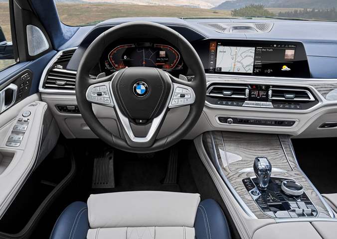 أما في الداخل فيبدو واضحًا تركيز المقصورة على قائد السيارة، فلوحة القيادة والكونسول الوسطي يميلان باتجاهه قليلاً، وتضيف الخطوط الانسيابية الأفقية للوحة القيادة مزيدًا من الإحساس برحابة المقصورة، فحتى فتحات المكيف وأزرار التحكم تأتي بترتيب أفقي، وتأتي السيارة X7 بشكل قياسي مع عجلة قيادة جلدية رياضية، وتشمل مجموعة العرض المصممة حديثًا شاشة تحكم ومجموعة عدادات رقمية بالكامل تتكامل مع لوحة التحكم المصممة بشكل كلاسيكي على الكونسول الوسطي..