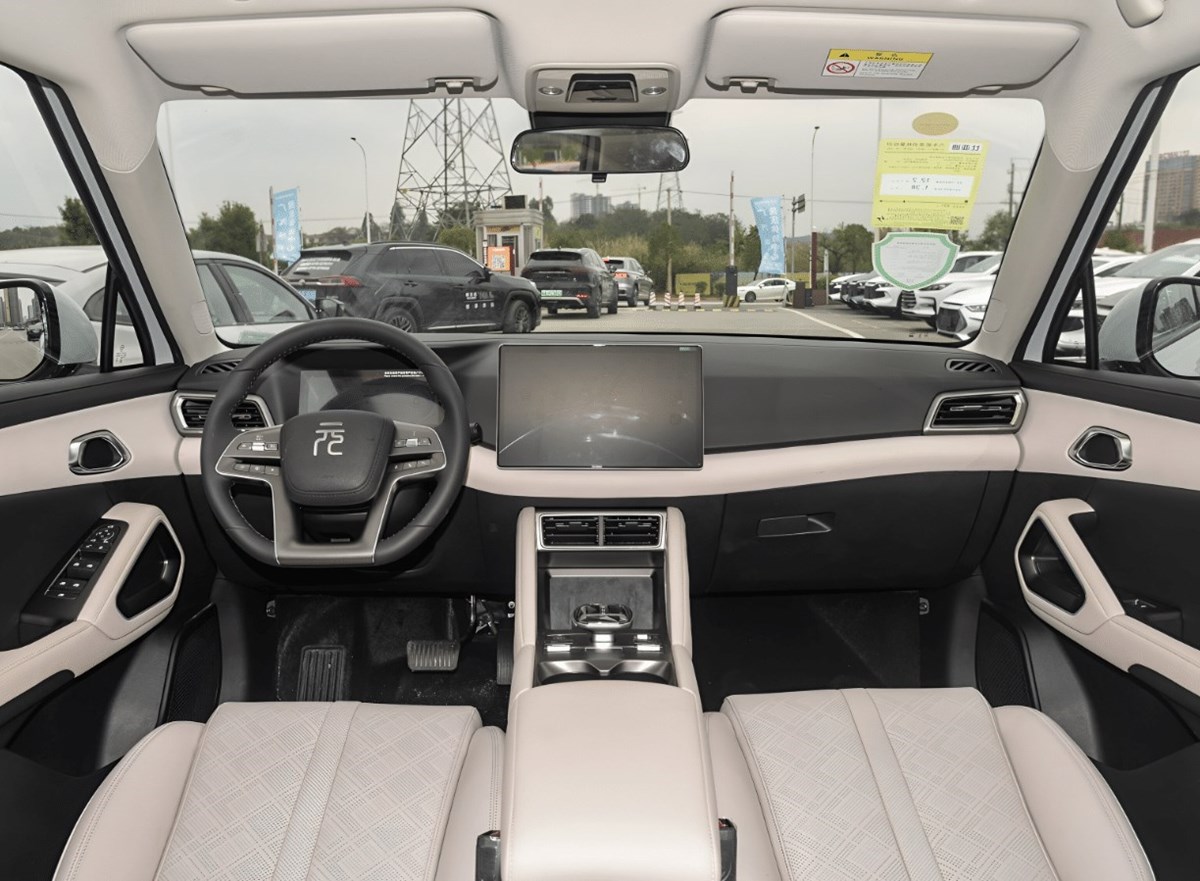 في الداخل، تتميز لوحة القيادة بشاشة عدادات رقمية LCD مقاس 8.8 بوصة، وشاشة للترفيه وعرض البيانات مقاس 12.8 بوصة قابلة للدوران، وعجلة قيادة على شكل حرف D مزينة بشعار "يوان"، كما تتميز السيارة بفرش داخلي من الجلد ومقاعد يمكن تعديلها كهربائيا، ويحتوي الكونسول الوسطي على منصة شحن لاسلكي للهواتف، وذراع ناقل حركة كريستالي، وأزرار مادية للتحكم في الوظائف الأساسية، بالإضافة إلى فتحة سقف بانورامية كبيرة، وإضاءة محيطية بألوان متعددة، ومساحة للأرجل تدعم الراحة بالصف الخلفي.