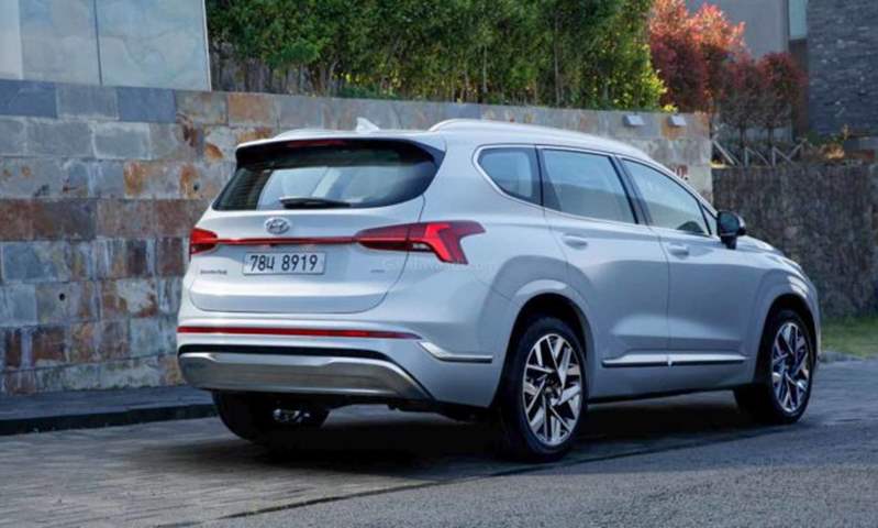 أما الجزء الخلفي، فتأتي سانتافي الجديدة مزودة بمصابيح خلفية LED متصلة ببعضها البعض وذلك بفضل وجود شريط LED يمتد بعرض السيارة أفقيًا، مع إعادة تصميم الصادم والعاكس الأفقي الرفيع، وتشمل العناصر الخارجية الأخرى قضبان السقف وسبويلر في السقف الخلفي وهوائي زعنفة سمك القرش.