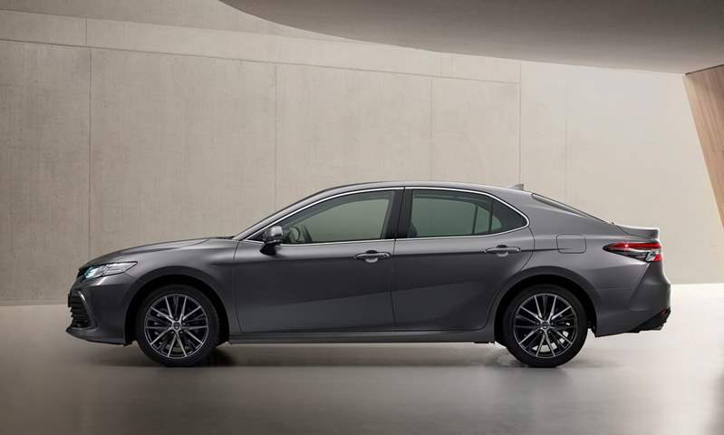 تمت إعادة تصميم مقدمة كامري هايبرد 2021، مع مصد أمامي جديد وشبكات علية وسفلية تضيف المزيد من الديناميكية والاتساع إلى مظهر السيارة، مع خطوط حادة على جانبي الشبكة السفلية وأسف المصابيح الأمامية تضيف الكثير من الحدة إلى ملامح كامري، وتتوافر الشبكة السفلية نفسها باللون الأسود أو الرمادي الداكن، في حين أن الزخرفة الجانبية تتوافر بالكروم أو اللون الفضي.