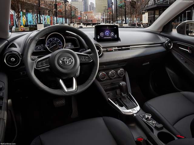في الداخل قد تدهشك الأناقة التي تقابلك بها مقصورة ياريس، فعجلة القيادة ذات ثلاثة أذرع وتحتوي على مجموعة من الأزرار للتحكم في وظائف الترفيه المختلفة، وهي ملفوفة بالجلد الذي تضم أطرافه خيوط بارزة، كما أن المقاعد الأمامية تأتي بتصميم رياضي وهي مكسوة بالجلد أيضًا، أما لوحة القيادة فذات تصميم بسيط يتميز بخطوط أفقية ناعمة، وتتوزع عليها فتحات المكيف الدائرية المصنوعة من الكروم الفضي اللامع، وتستقر أعلاها شاشة لمسية ملونة مقاس 7 بوصة تتصل بنظام الوسائط المتعددة مع خاصية التعرف على الصوت، وتتمتع المقصورة بنظام صوتي مكون من ست سماعات مع راديو متصل بالأقمار الصناعية..