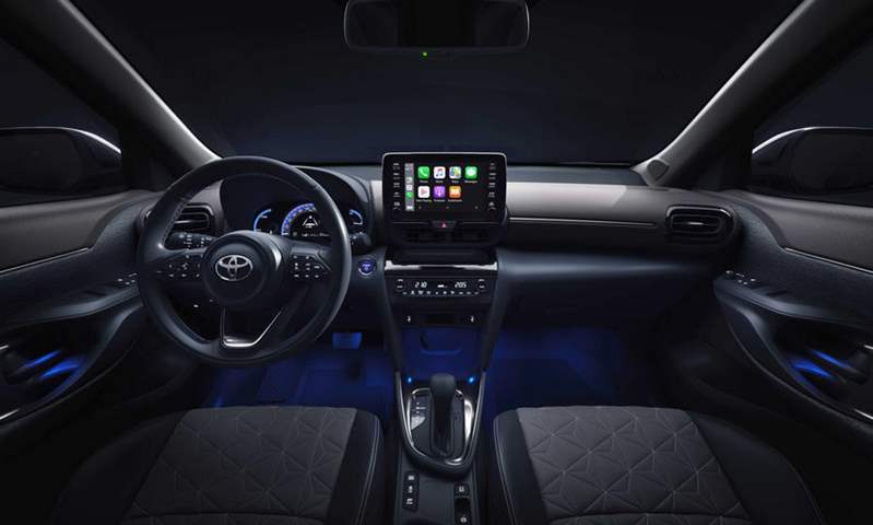 استمر تطبيق مفهوم البساطة داخل مقصورة ياريس كروس، فجاءت خالية من زحام الأزرار والمفاتيح، واكتفى فريق التصميم بوجود شاشة كبيرة LCD تطفو في منتصف لوحة القيادة، يتم عبرها التحكم في أنظمة السيارة وعرض المعلومات والبيانات إلى جانب التحكم في أنظمة الترفيه، مع إمكانية الاتصال بالهواتف الذكية عبر تطبيقات Apple CarPlay، و Android Auto.. وأسفلها مجموعة بسيطة من الأزرار والمفاتيح. واحتوت عجلة القيادة أيضًا على مجموعة من الأزرار بحيث لا يحتاج قائد السيارة لإبعاد يديه عنها إلا قليلاً، كما تم توفير شاشة عرض رأسي Head Up Display لتقليل حركة عين السائق وانشغالها بعيدًا عن الطريق أمامه، وذلك تطبيقًا لمبدأ ابقاء العين على الطريق من أجل المزيد من السلامة.
