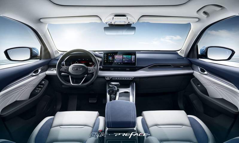 تبدو المقصورة شديدة الاتساع بفضل الخطوط الأفقية التي تهيمن على تصميمها، والتي نراها واضحة على لوحة القيادة والأبواب، وحتى في عجلة القيادة التي تأتي مسطحة القاعدة، وشاشة العرض الأفقية التي تأتي بمقاس 12.3 بوصة المدعومة بنظام المعلومات والترفيه GKUI Smart EcoSystem من جيلي، ولوحة عدادات رقمية عريضة.