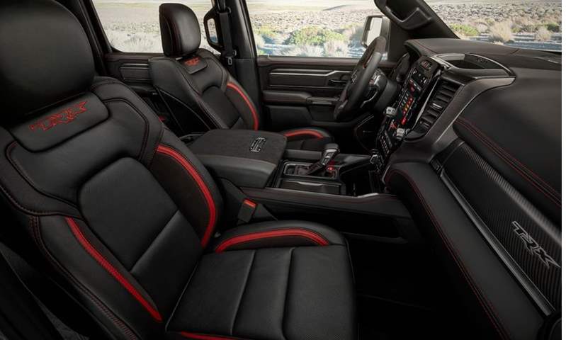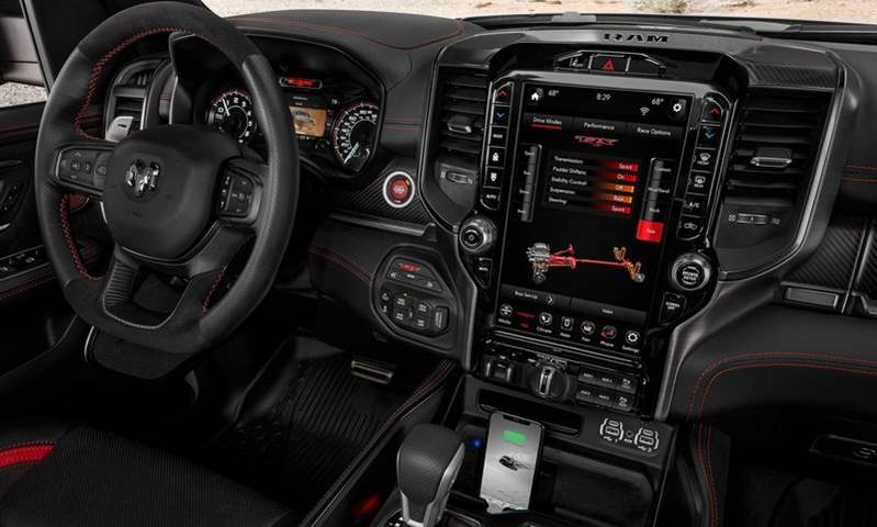 بالنسبة للوحة القيادة فتحتوي في المنتصف على شاشة لمس كبيرة مقاس 12 بوصة تعمل بنظام UConnect 4C، ويحيط بها مجموعة من الأزرار ومفاتيح التحكم الخاصة بإطلاق الوحش العملاق وأنظمة قيادته، إلى جانب خمسة فتحات USB وإمكانية الشحن بدون سلك. وخلف عجلة القيادة تتألق العدادات وبيانات الأداء على شاشة رقمية مقاس 7 بوصة. ويمكن اختيار شاشة رقمية LCD مقاس 9.2 بوصة لنقل الرؤية الخلفية من خلال كاميرا مثبتة بدلاً من المرآة التقليدية المخصصة لذلك. ومتاح أيضًا نقل العرض بين الرؤية الأمامية والخلفية ضمن نظام كاميرا يحيط بالسيارة بالكامل بزاوية 360ْ.