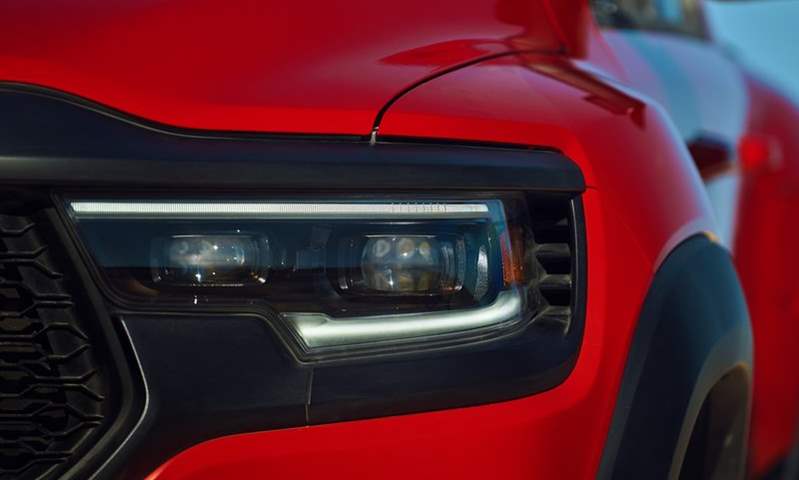 تتمتع رام بملامح حادة تبدو ملائمة لطبيعة أدائها شديد القوة، ففي المقدمة تستقر شبكة أمامية عملاقة، وقد بدت حروف RAM العملاقة وكأنها تطفو في منتصفها، وعلى جانبيها المصابيح الأمامية يحيط بها إطار متوهج LED على شكل حرف U مقلوب، أما الجزء السفلي من المقدمة فيحتوي على شبكة أخرى سفلية ضيقة على جانبيها يستقر مصباحا ضباب، ويمتد إليها من الأسفل لوح فضي بدا وكأنها غطى على جزء من الشبكة، يعمل على حماية بدن السيارة من الأجسام الصغيرة التي قد تصطدم بها أثناء انطلاقها على الطرق الوعرة. وعلى جانبي هذا اللوح برزت قطعتين يمكن ربط خطاف فيها من أجل مهمام الجر والسحب.