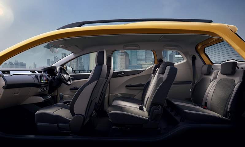 المقصورة الداخلية تتسع لسبعة ركاب كحد أقصى، وفي هذه الحالة تكون سعة الحقيبة الخلفية 84 لتراً فقط، أما في حالة التخلي عن راكب واحد من السبعة فتكبر الحقيبة وتصبح سعتها 320 لتر، أما في حالة جلوس خمسة ركاب فتصبح سعة الحقيبة الخلفية منافسة لطرازات أكبر منها في الفئة حيث تتسع لـ 625 لتر، وبالمقارنة تتسع حقيبة كابتشر إلى 377 لتر يمكن زيادتها مع دفع المقعد الخلفي إلى الأمام لتصبح 455 لتر، وهو ما يكشف عن مدى اتساع حقيبة تريبر الجدية، وتقول رينو أن طرازها الجديد يوفر أكثر من 100 وضعية لترتيب المقاعد داخله، وهو أمر بالغ المرونة بشكل استثنائي.