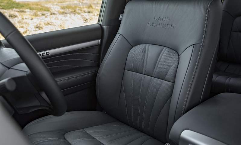 في الداخل انساب المزيد من اللون الأسود في الأنحاء تتخلله لمسات الكروم، فاكتست المقاعد بالجلد الأسود مع خياطة عالية الجودة على الأبواب من الداخل، ويظهر اسم لاند كروزر بحجم كبير على ظهر المقاعد الأمامية التي تتمتع بخاصية التدفئة والتهوية مع إمكانية تعديل وضعها كهربائيًا. وتتمتع المقصورة بعدة مزايا أخرى مثل: