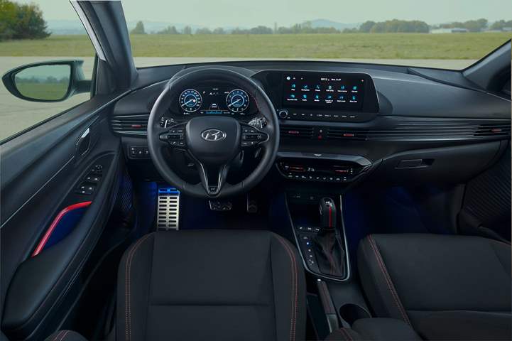 وتستمر التعديلات في المقصورة الداخلية لتصل إلى المقاعد الرياضية التي تحمل شعار N بخياطة مميزة باللون الأحمر، بالإضافة إلى عجلة قيادة N مخصصة، ومقبض ناقل حركة جلدي مع حلية حمراء، ودواسات معدنية.
